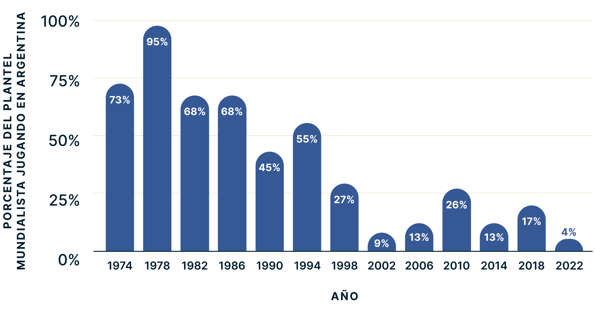 En el siguiente gráfico comparativo, se puede ver qué porcentajes de los planteles argentinos que fueron a los mundiales estaban formados por jugadores jugando en Argentina (desde 1974 en adelante), y muestra de forma muy evidente quiénes son los representantes de la ‘nuestra’: