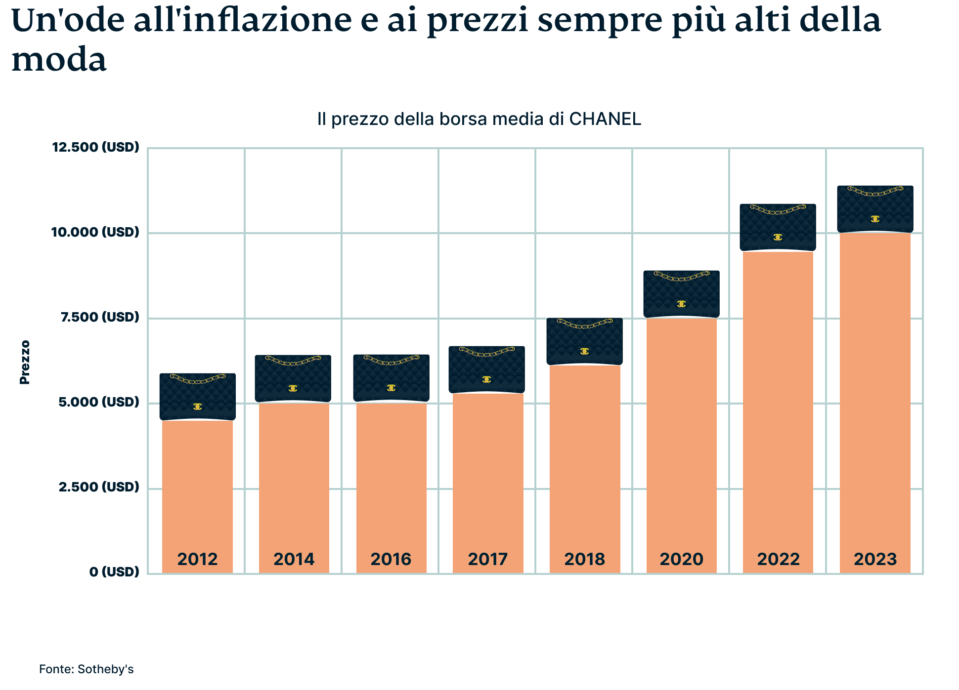 Anche le borse Chanel hanno subito un significativo aumento di prezzo nel corso degli anni, l'ultimo dei quali nel marzo di quest'anno. Sotheby's riporta che Chanel ha aumentato il prezzo della sua borsa Medium Classic Flap del 16% (ora viene venduta a oltre 10.000 dollari). Anche altri modelli popolari come la Coco Handle, la Chanel 19 e la Pearl Crush hanno subito un aumento di prezzo del 14%.
