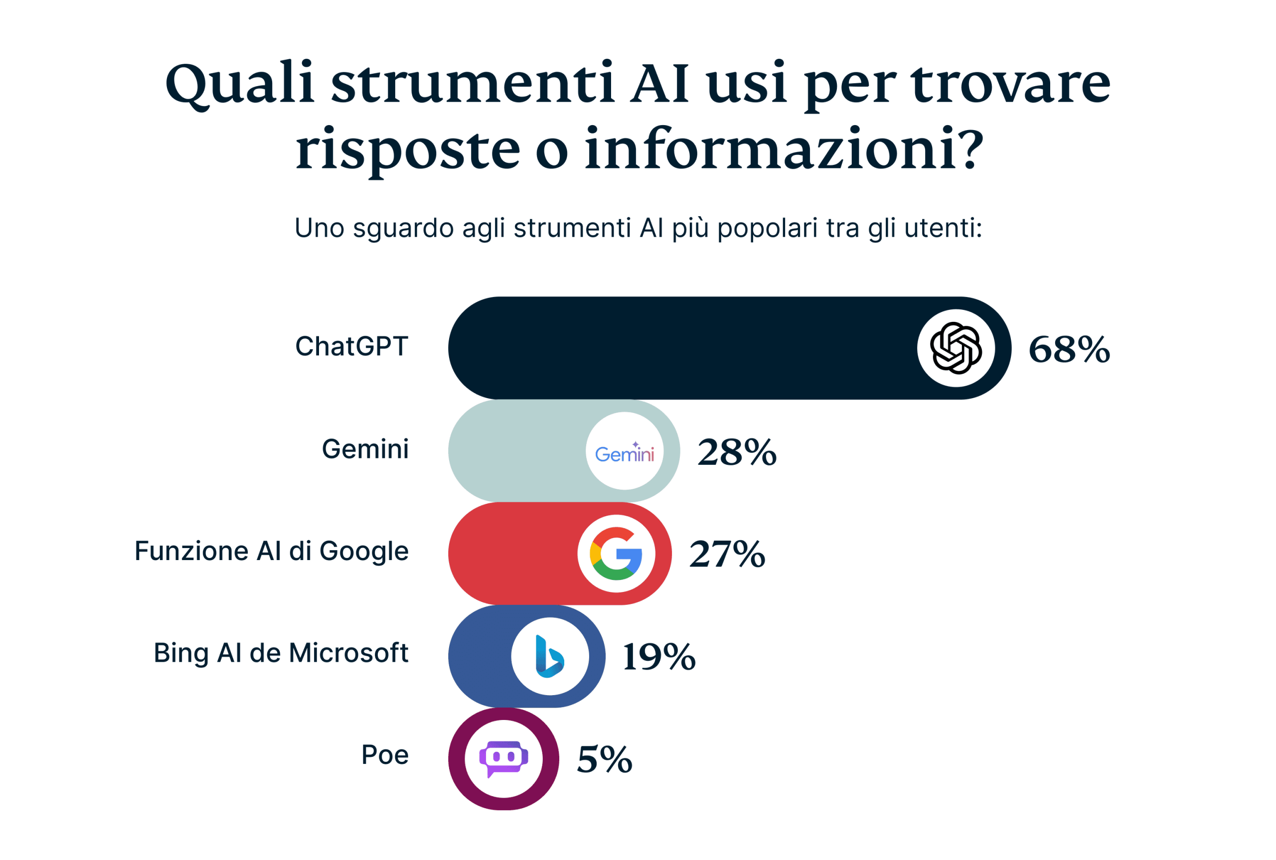 Quando si parla di strumenti AI, ChatGPT è chiaramente il preferito. Quasi 7 utenti su 10 (68%) lo indicano come la loro scelta principale per ottenere risposte, con concorrenti come Gemini (28%) e Bard (27%) che seguono a distanza. Il formato conversazionale di ChatGPT e la capacità di fornire risposte approfondite lo hanno reso uno strumento di spicco, soprattutto tra gli utenti più giovani che cercano risposte personalizzate e coinvolgenti.