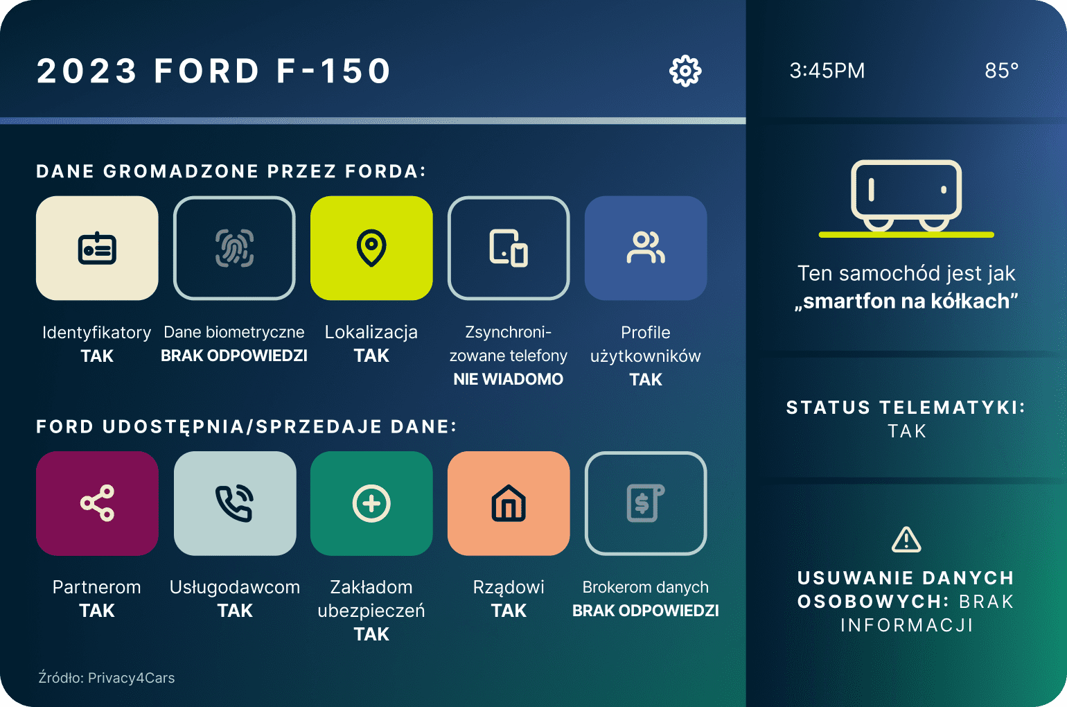 - Privacy4Cars, amerykańska firma motoryzacyjna, na początku tego roku wprowadziła narzędzie o nazwie „Vehicle Privacy Report” (ang. „Raport dotyczący prywatności pojazdu”), aby informować kierowców o zakresie gromadzenia danych przez ich pojazdy.