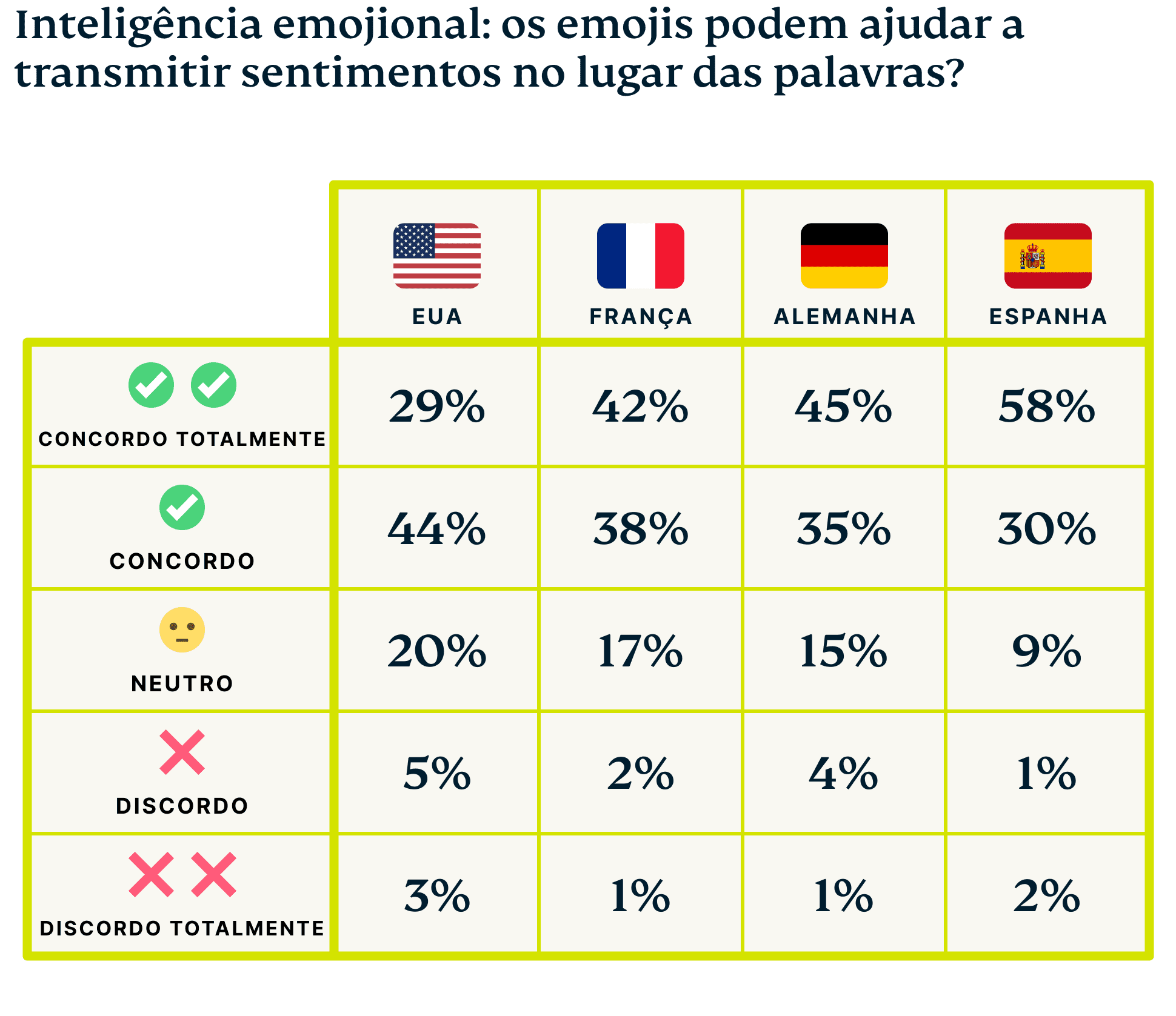 Mais da metade (51%) dos americanos disse que não acredita que os emojis atenuem o impacto das notícias ruins — um sentimento mais comum nos EUA do que na França, Alemanha ou Espanha. No entanto, mais da metade compartilha que também usou emojis para esconder como se sente.