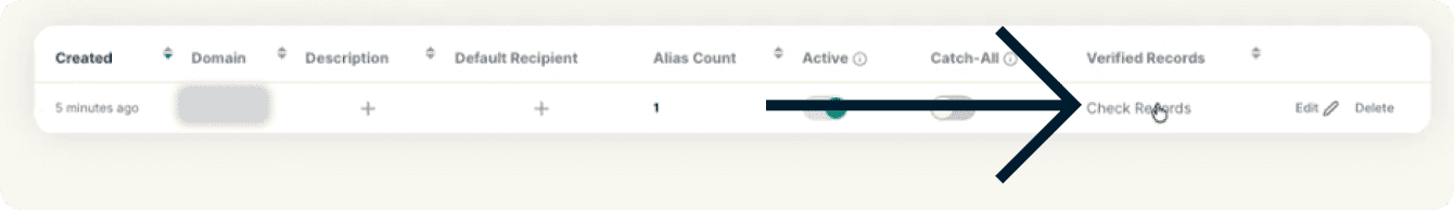 - Find the custom domain you want to verify and click Check Records under the Verified Records column.