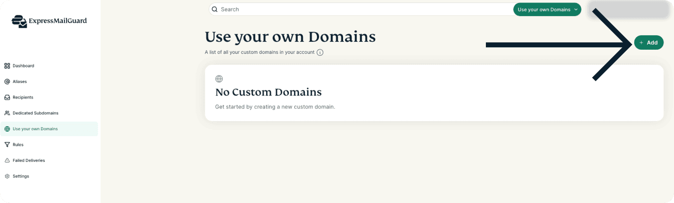 - On the ExpressMailGuard dashboard, click Use your own Domains.