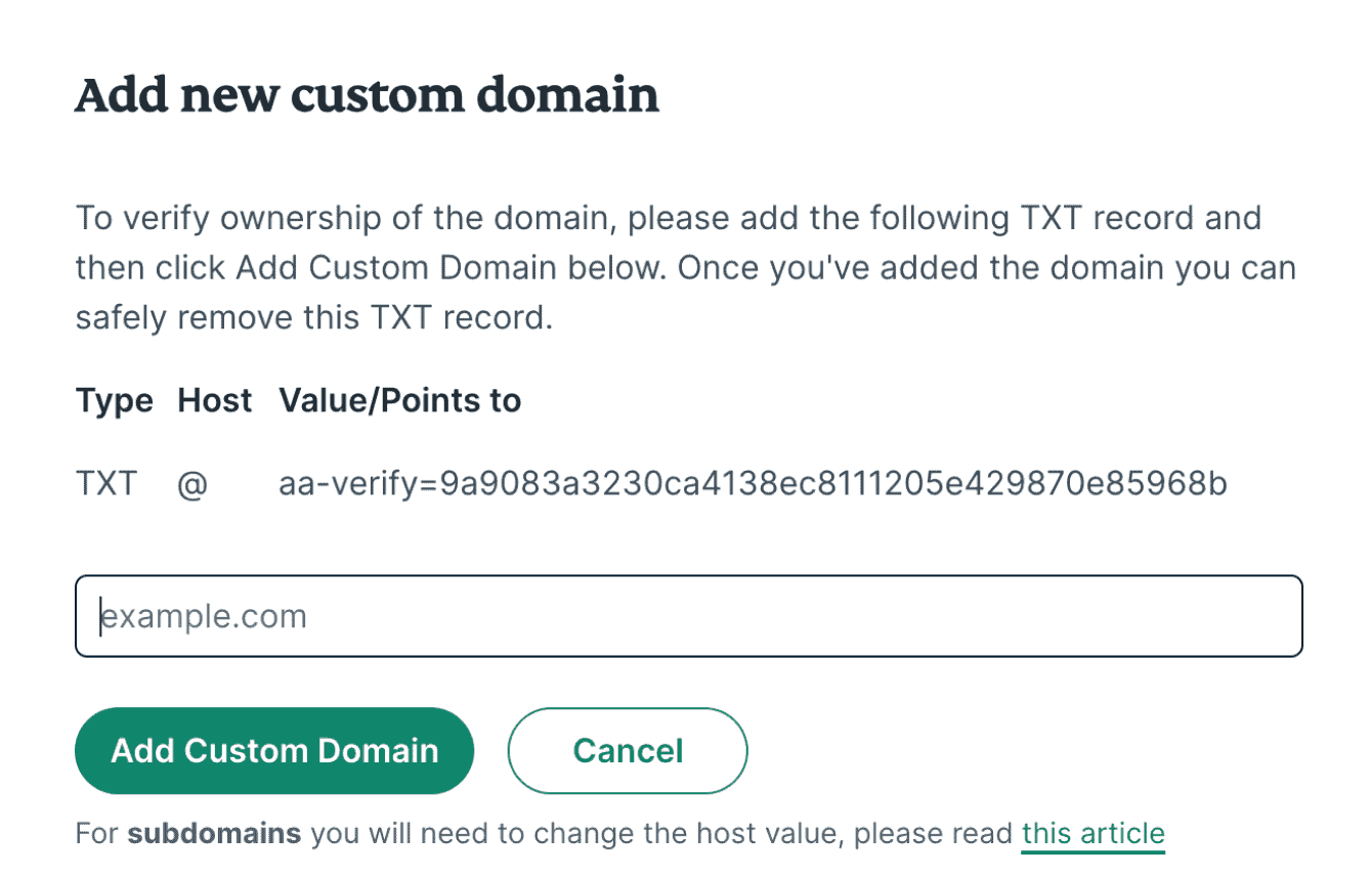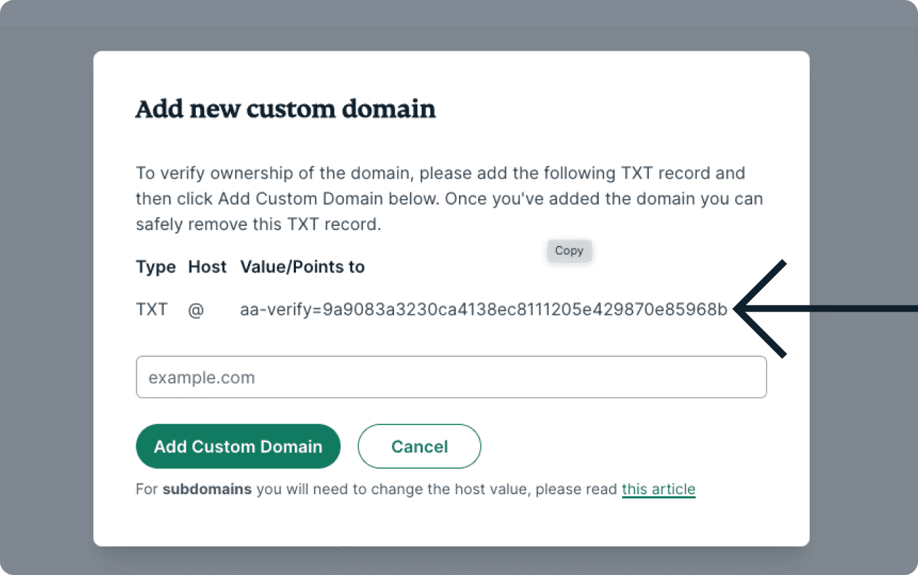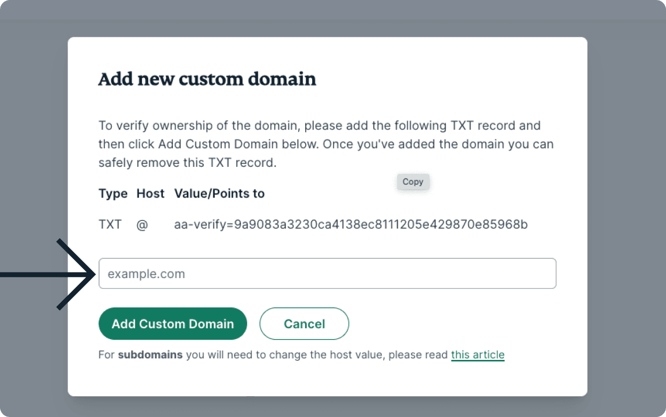 To verify your ownership and add your custom domain:
