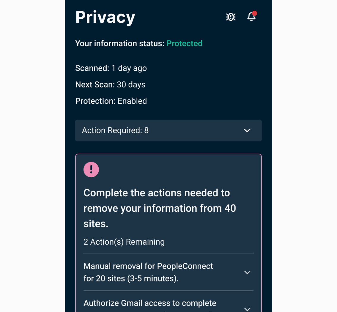 While Identity Defender handles most requests automatically, some sites require you to take additional steps to remove your information. If a site requires manual intervention, you will see it in the Privacy tab, followed by Action Required in the dropdown menu. We will provide you with clear guidance on how to complete the removal.