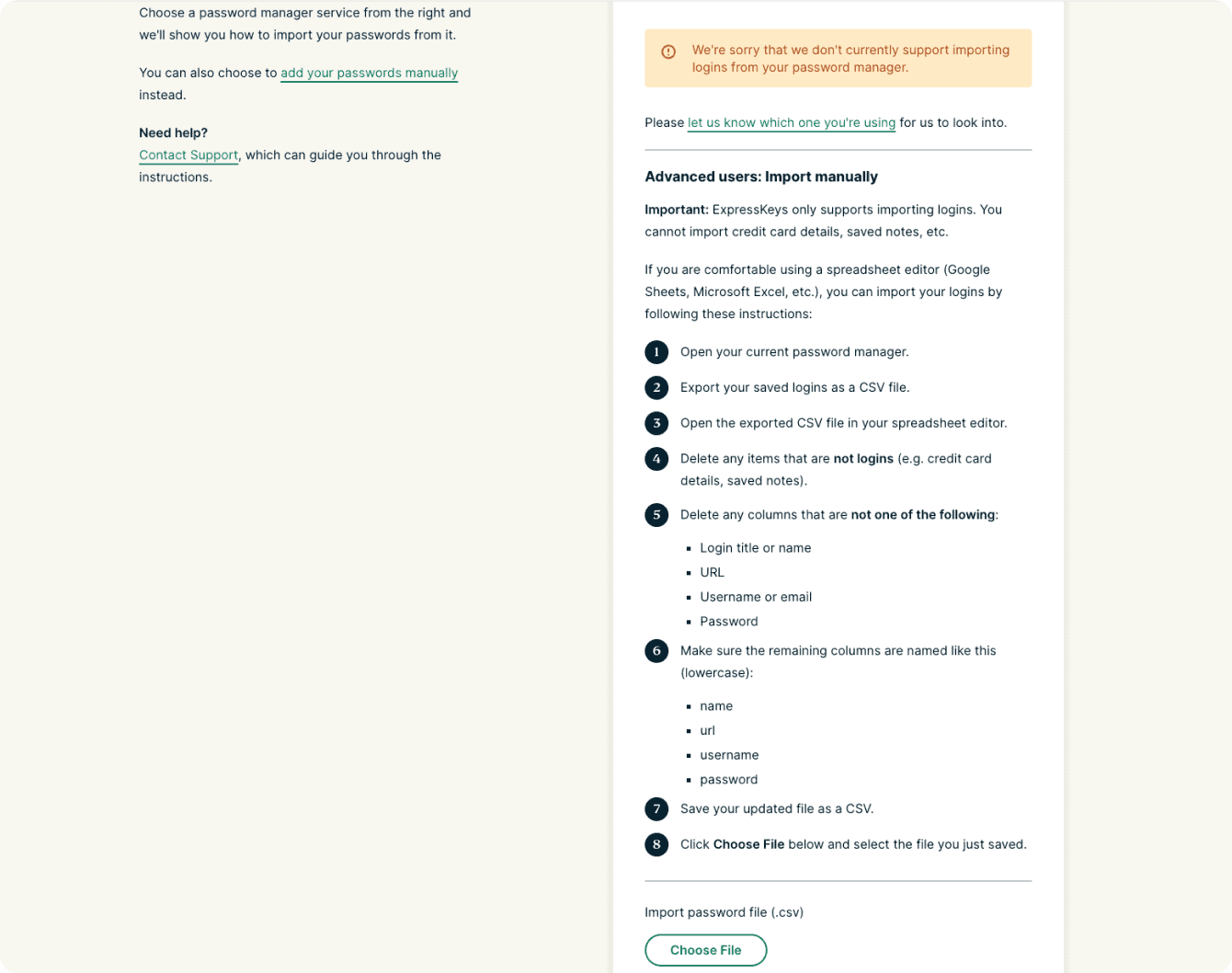 If you want to import your logins and other data (secure notes and credit/debit cards) into ExpressKeys from a password manager service which is not listed above, follow these steps instead: