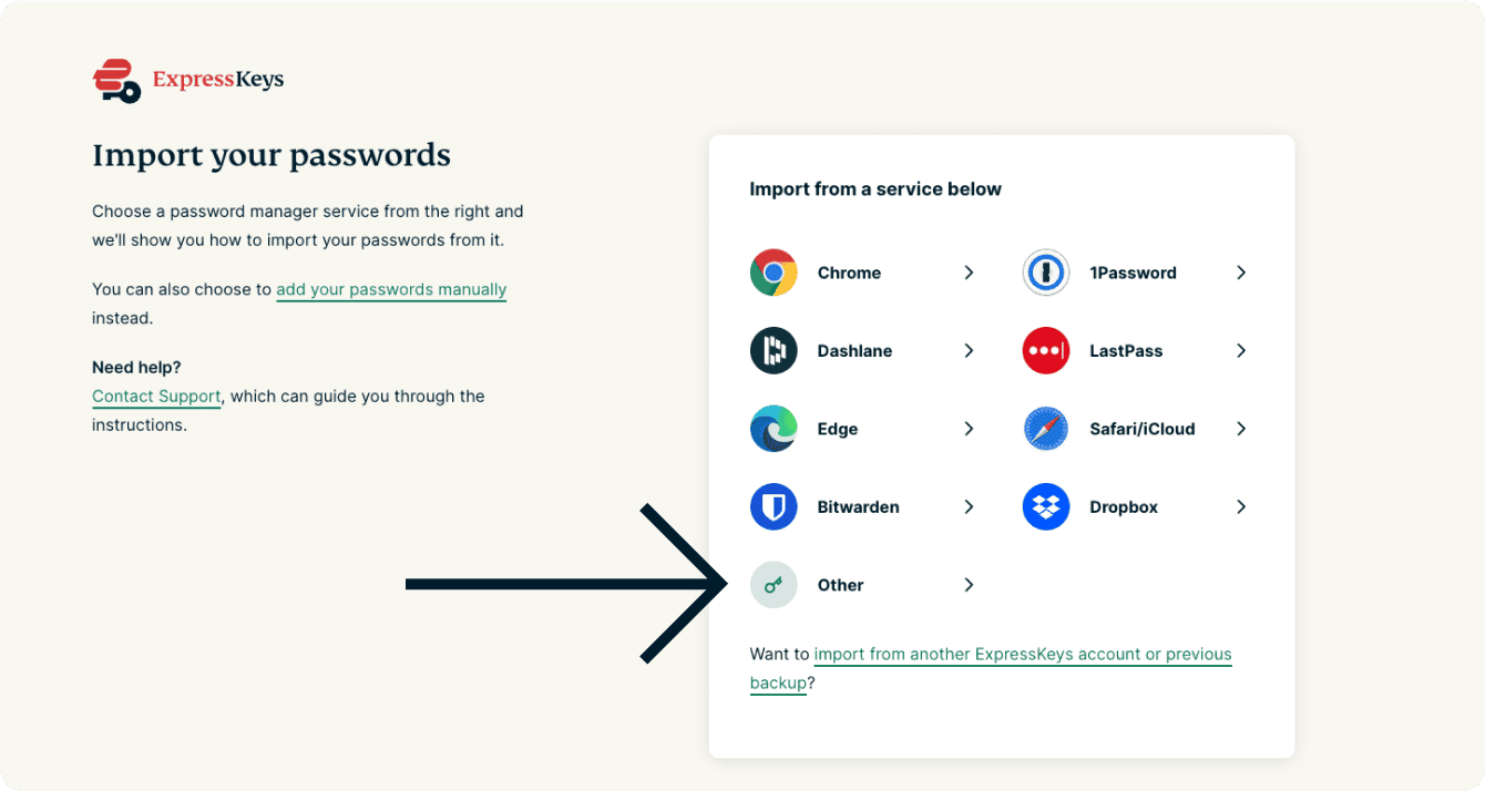 You can import your logins and other data (secure notes and credit/debit cards) from these password services into ExpressKeys.
