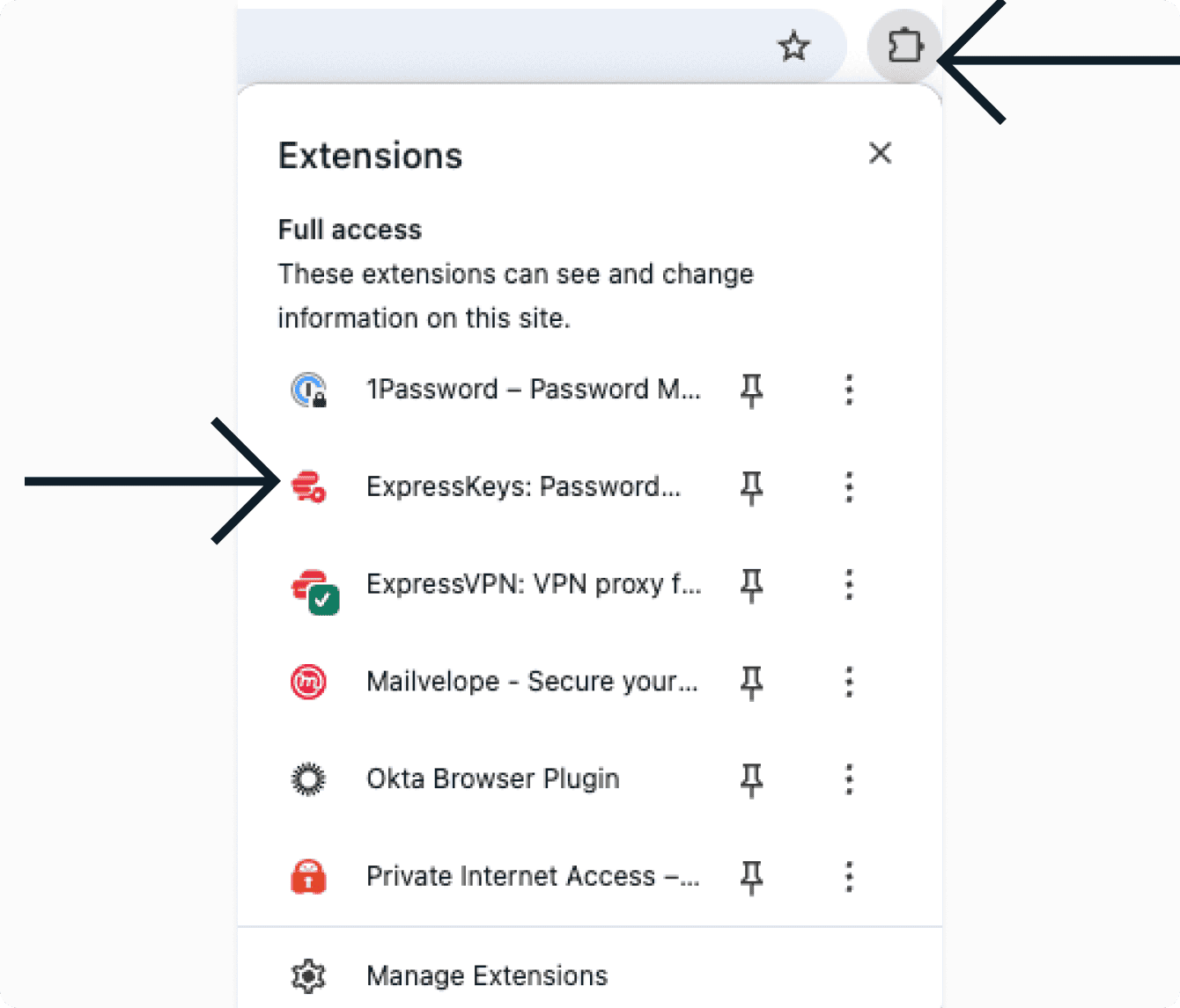 - In Chrome, Opera, Edge, Vivaldi, or Brave, install the ExpressVPN Keys browser extension for Chrome.