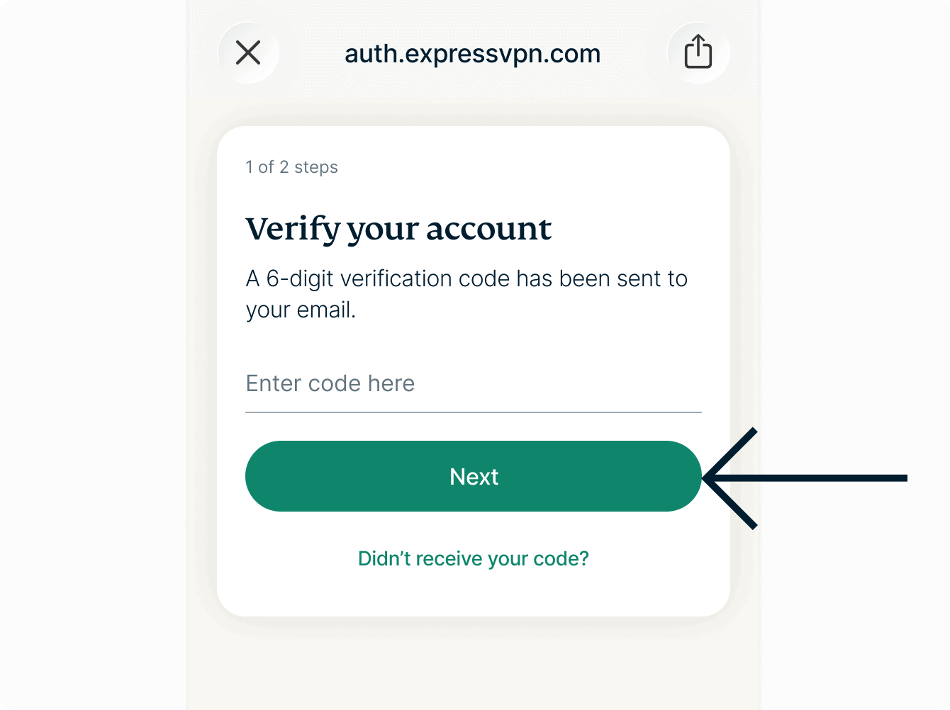 - You may be asked to provide a six-digit verification code. You can find the code in an email titled ExpressVPN verification code sent to the email address tied to your ExpressVPN account. Enter the code and tap Next to continue.