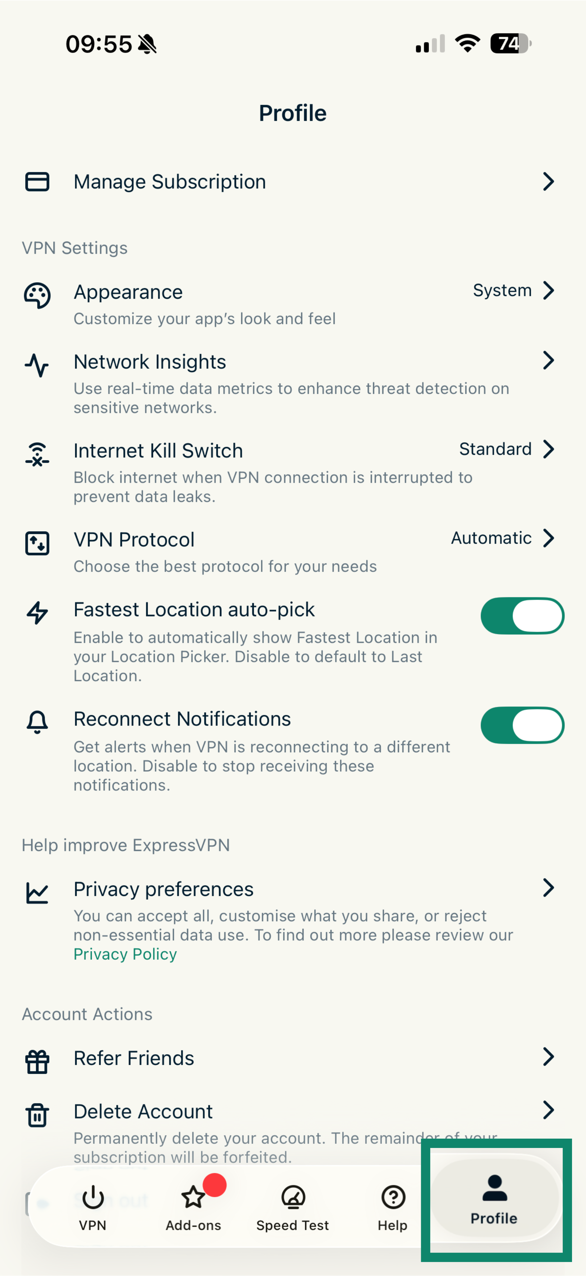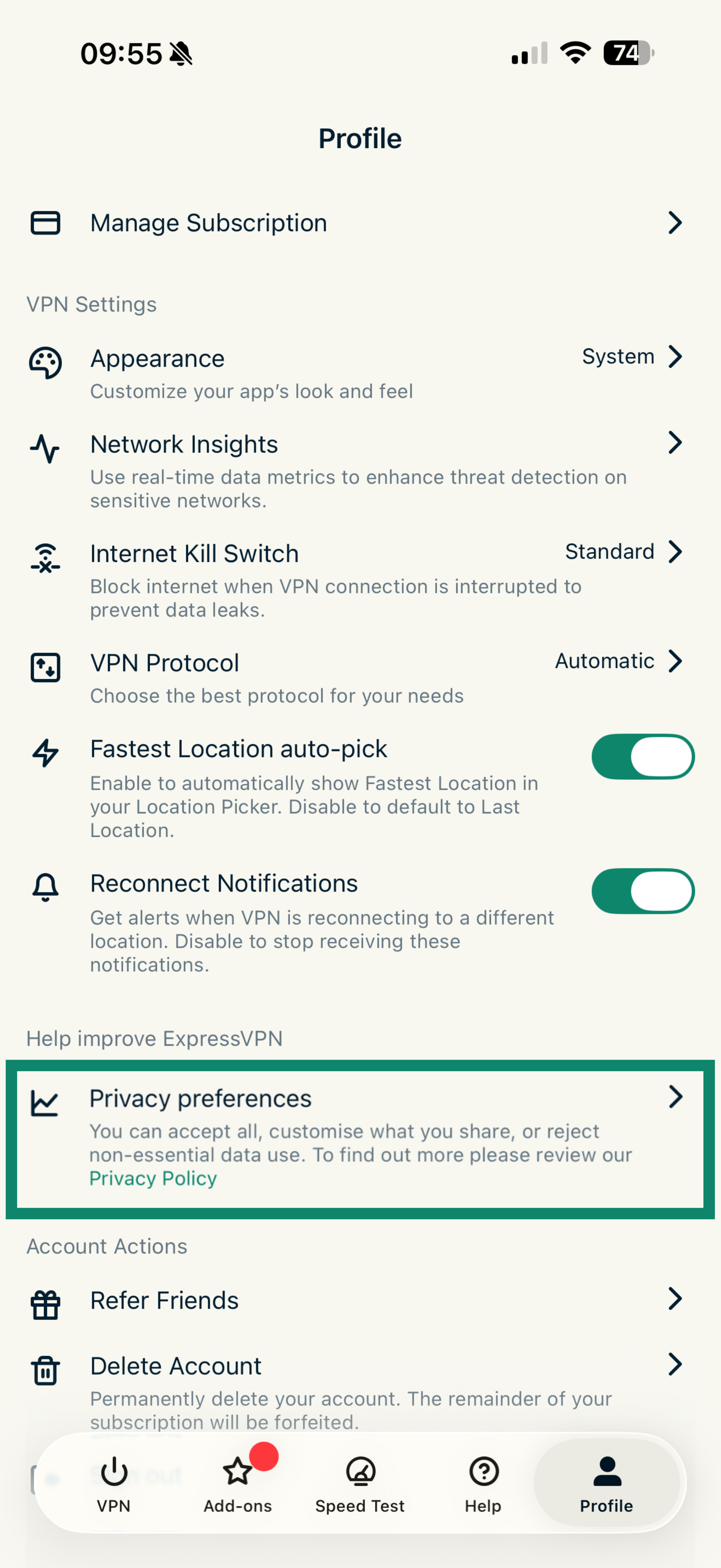 To find your privacy preferences in ExpressVPN mobile apps: