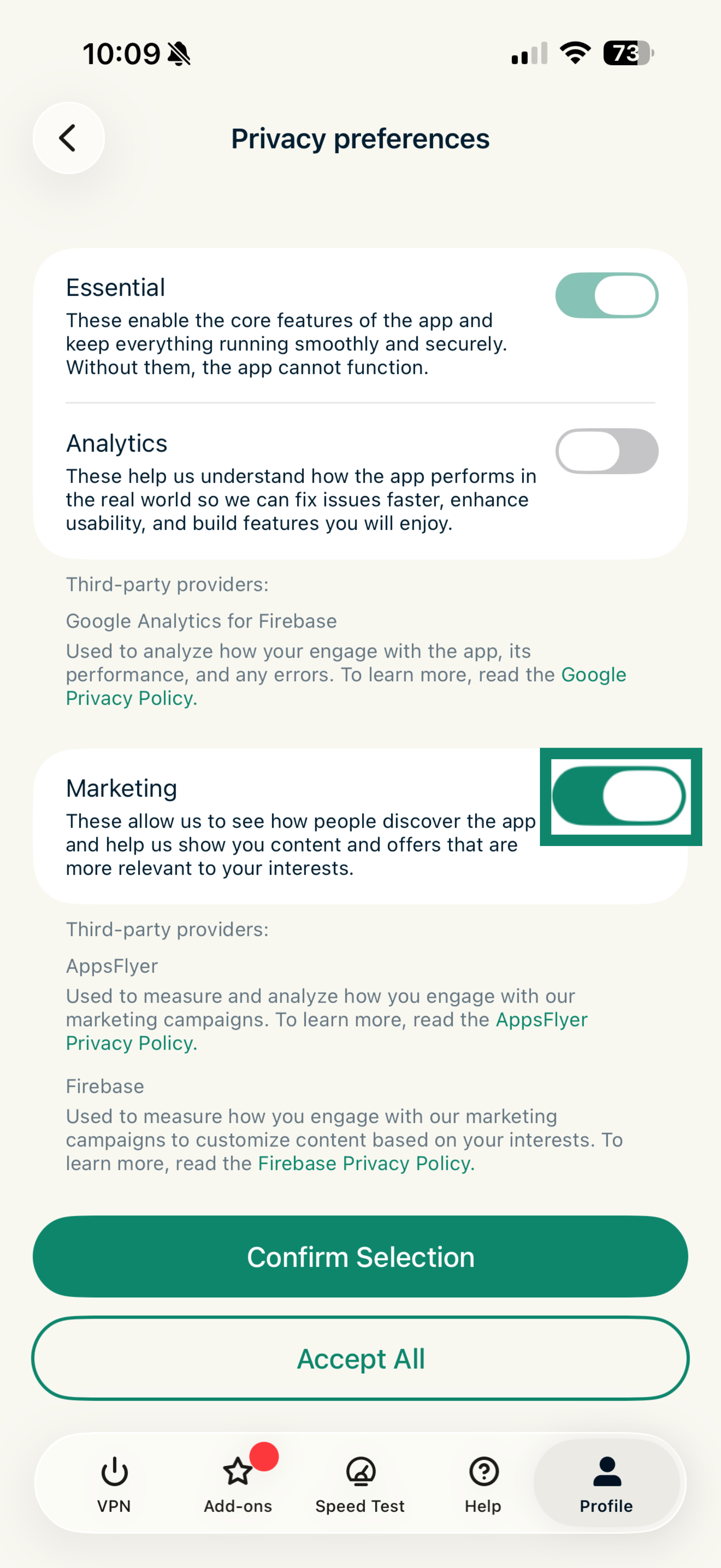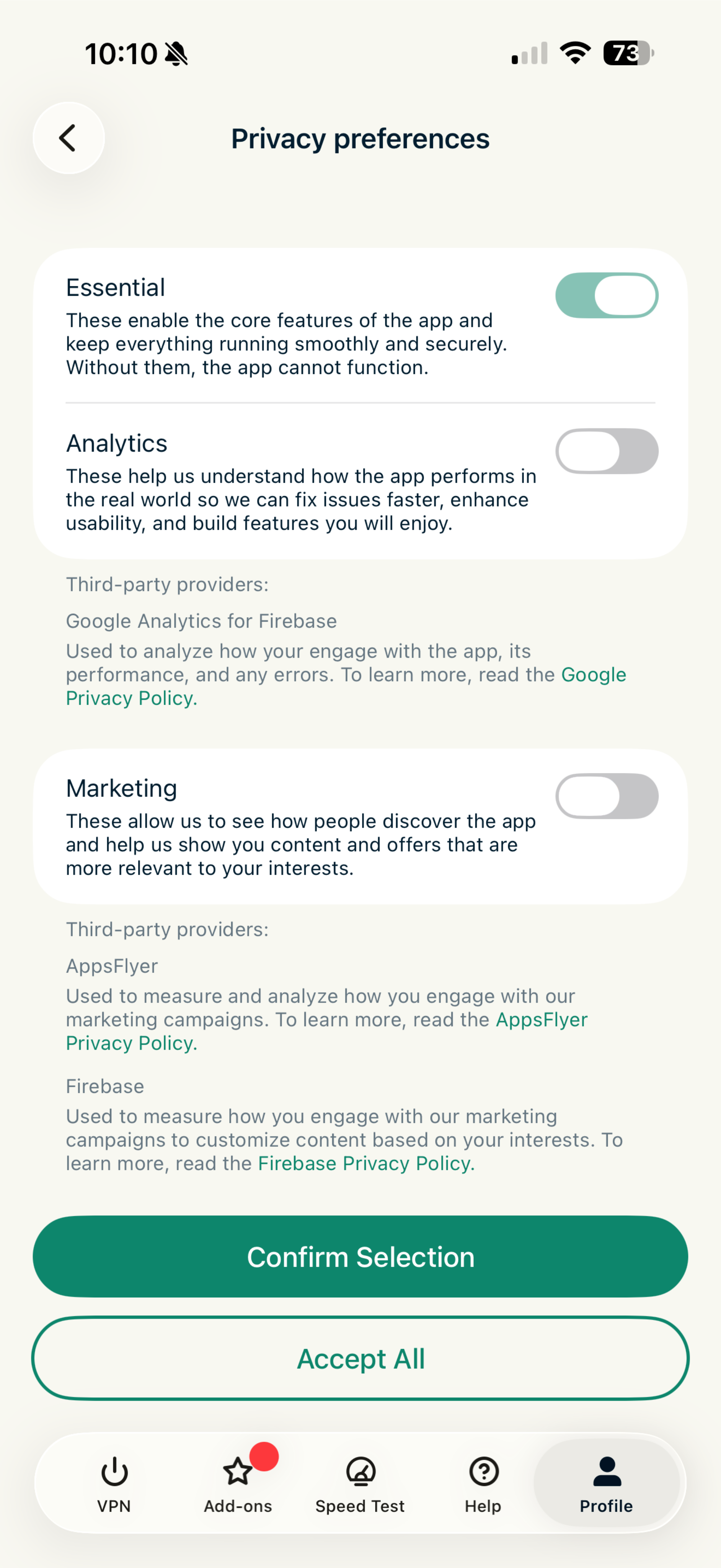 Privacy preferences lets you choose whether the ExpressVPN app shares certain information, such as analytics and marketing data, to help improve the app and your experience. You can change your preferences at any time.