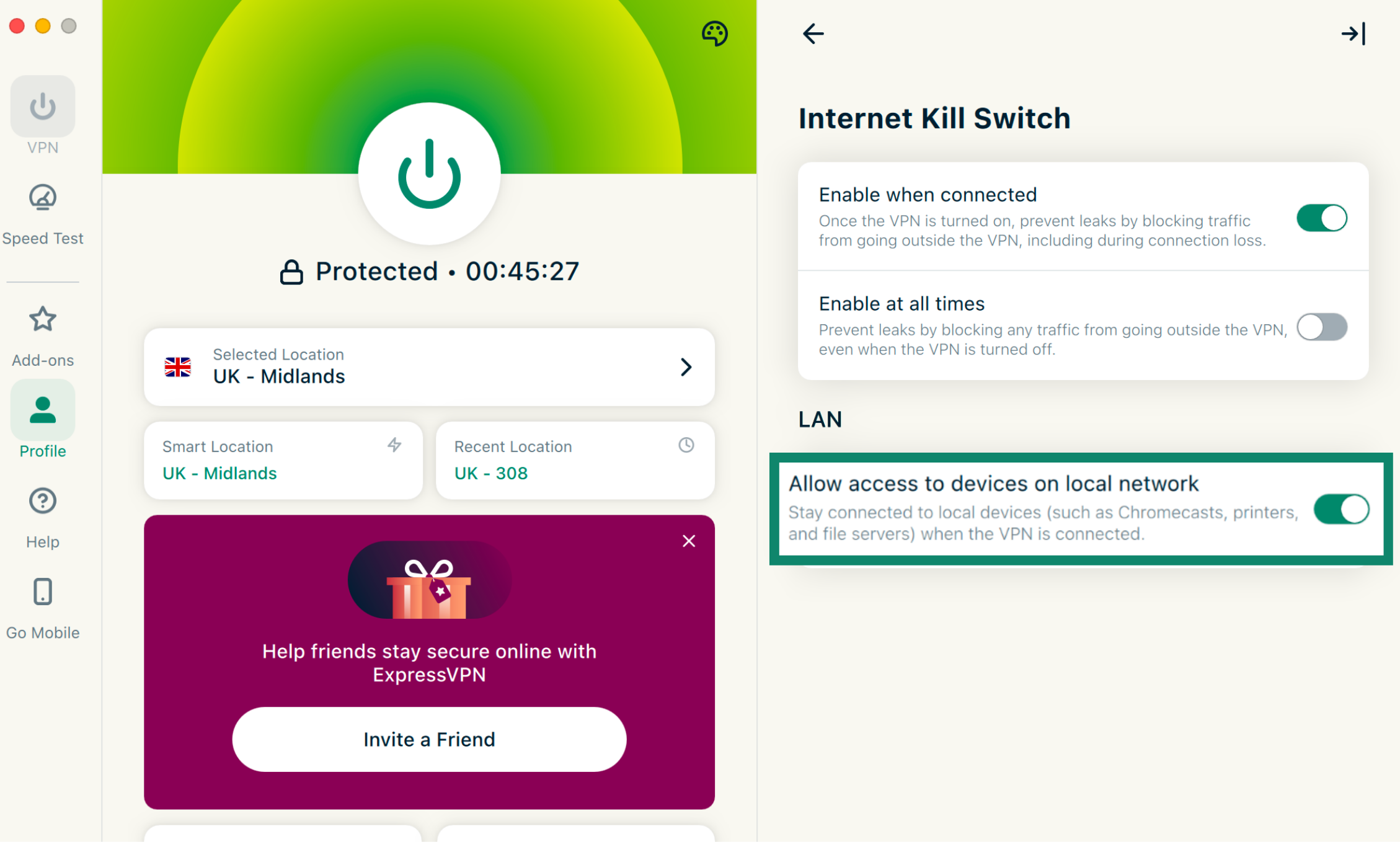 If you’re using the ExpressVPN app on desktop, you should allow access to your local network first. This ensures your email app can communicate with devices and services on your network while connected to the VPN.