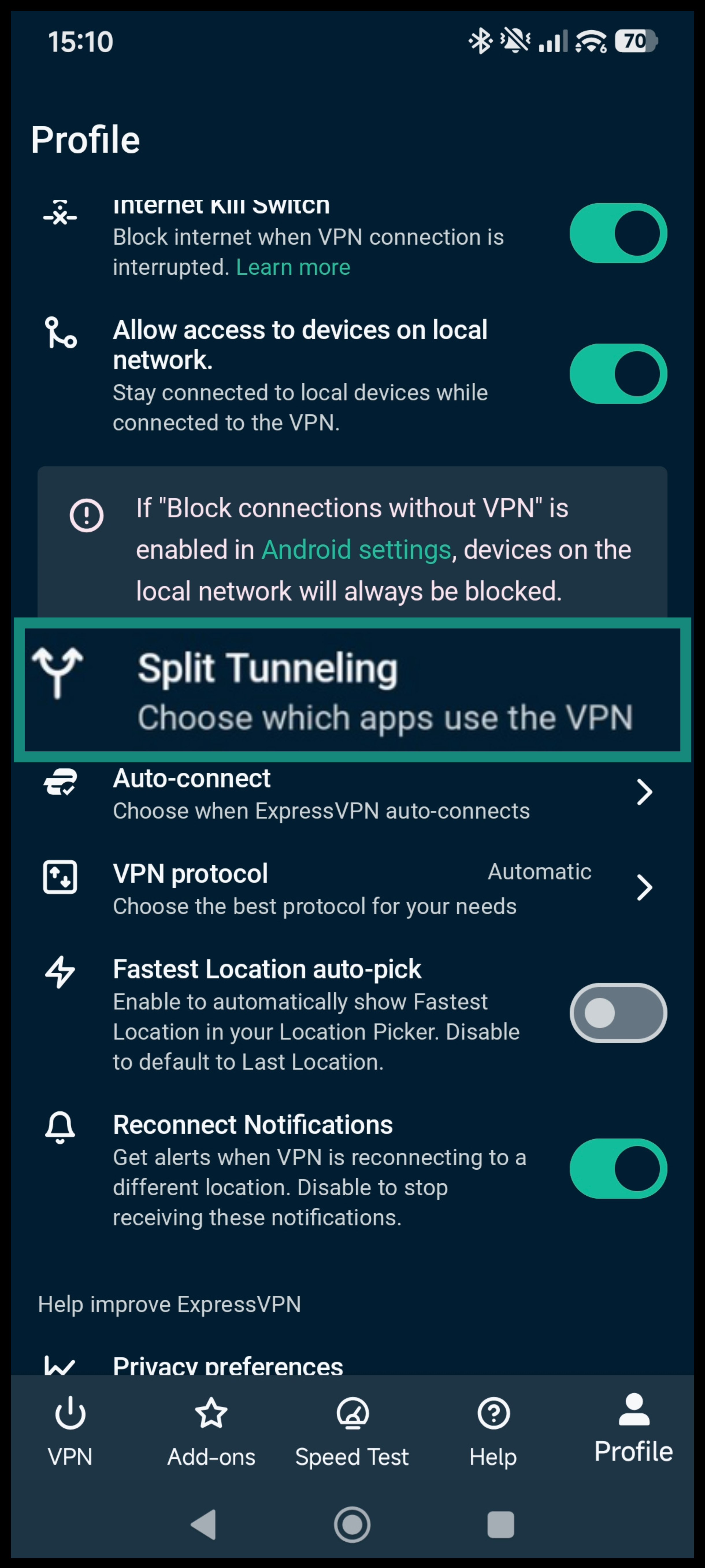 If you’re using ExpressVPN on Android, you don’t need to change this setting. The ExpressVPN Android app allows local network access by default. You can skip to excluding your email app from connecting to the VPN on Android.