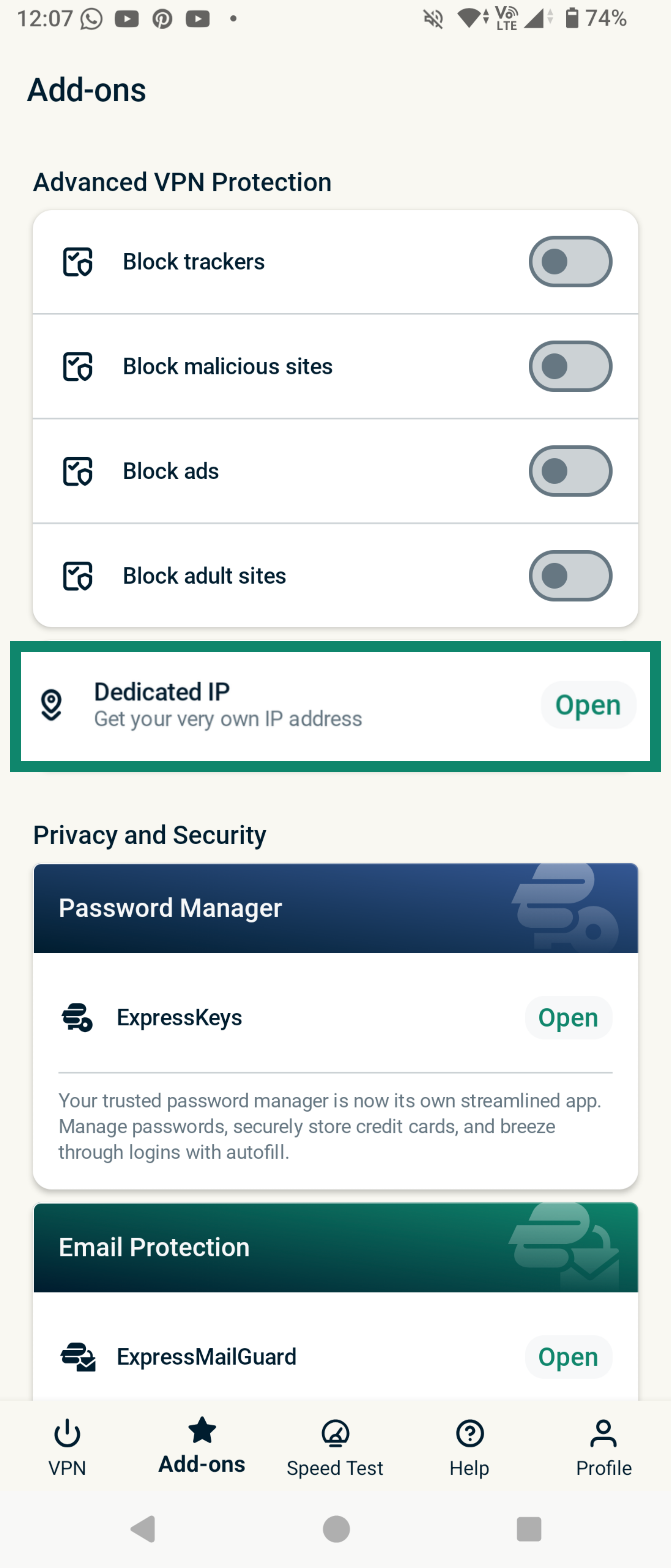 - Under Privacy and Security, click Dedicated IP.
