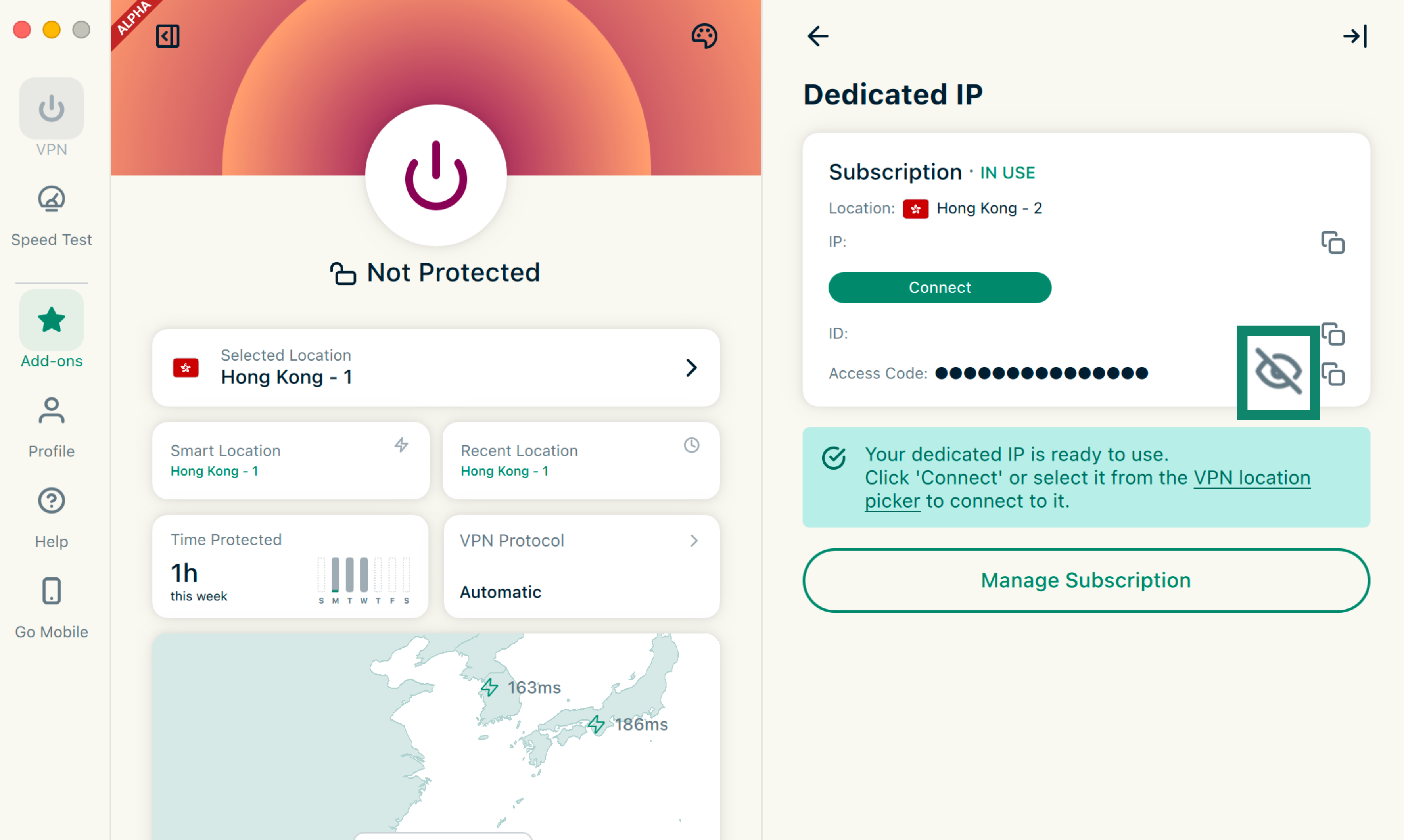 Retrieve your dedicated IP access code on desktop