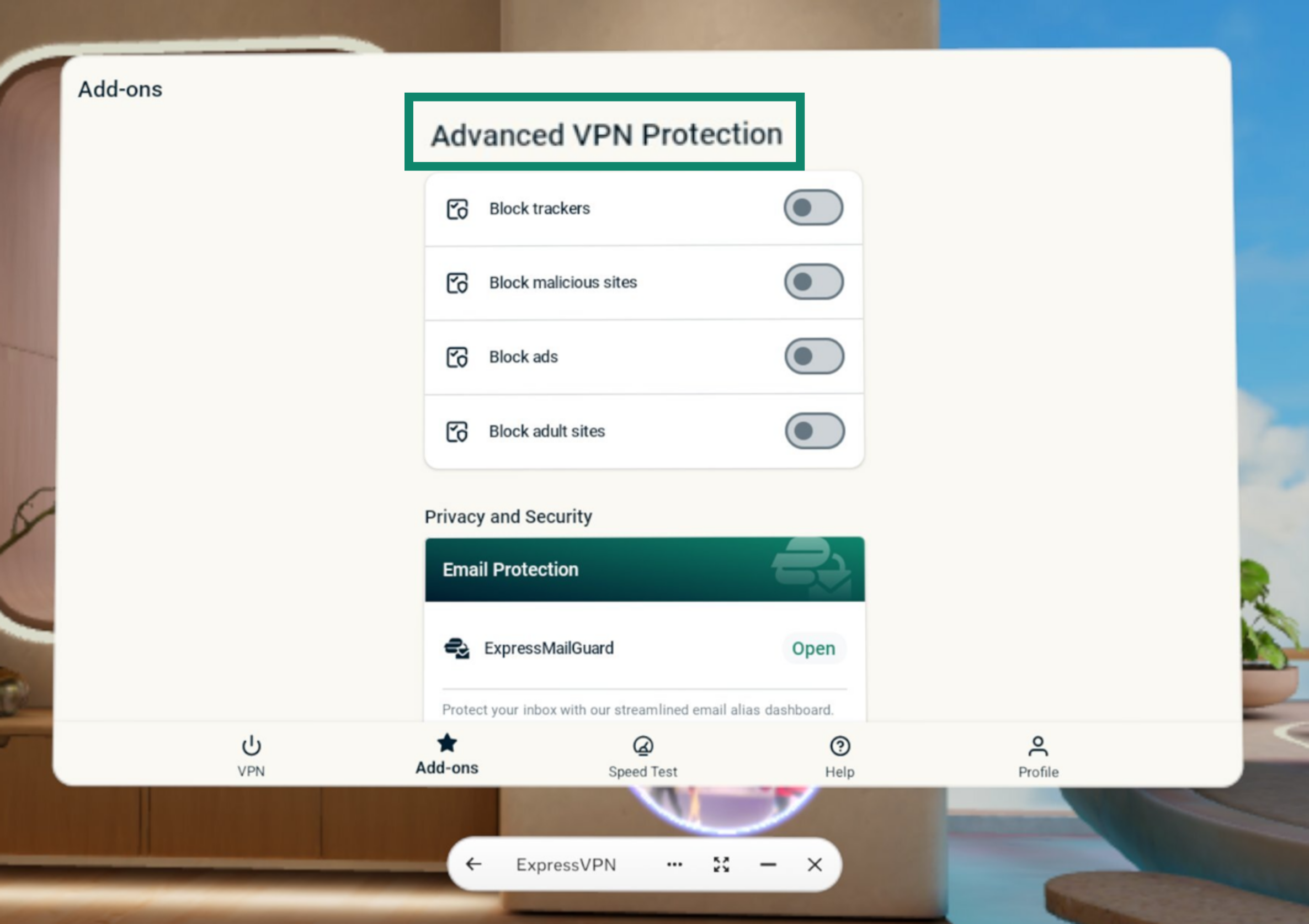 Customize your online experience and take back control over what companies know about you. You can block ads, trackers, malicious sites, and adult content from within the ExpressVPN app.