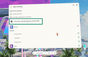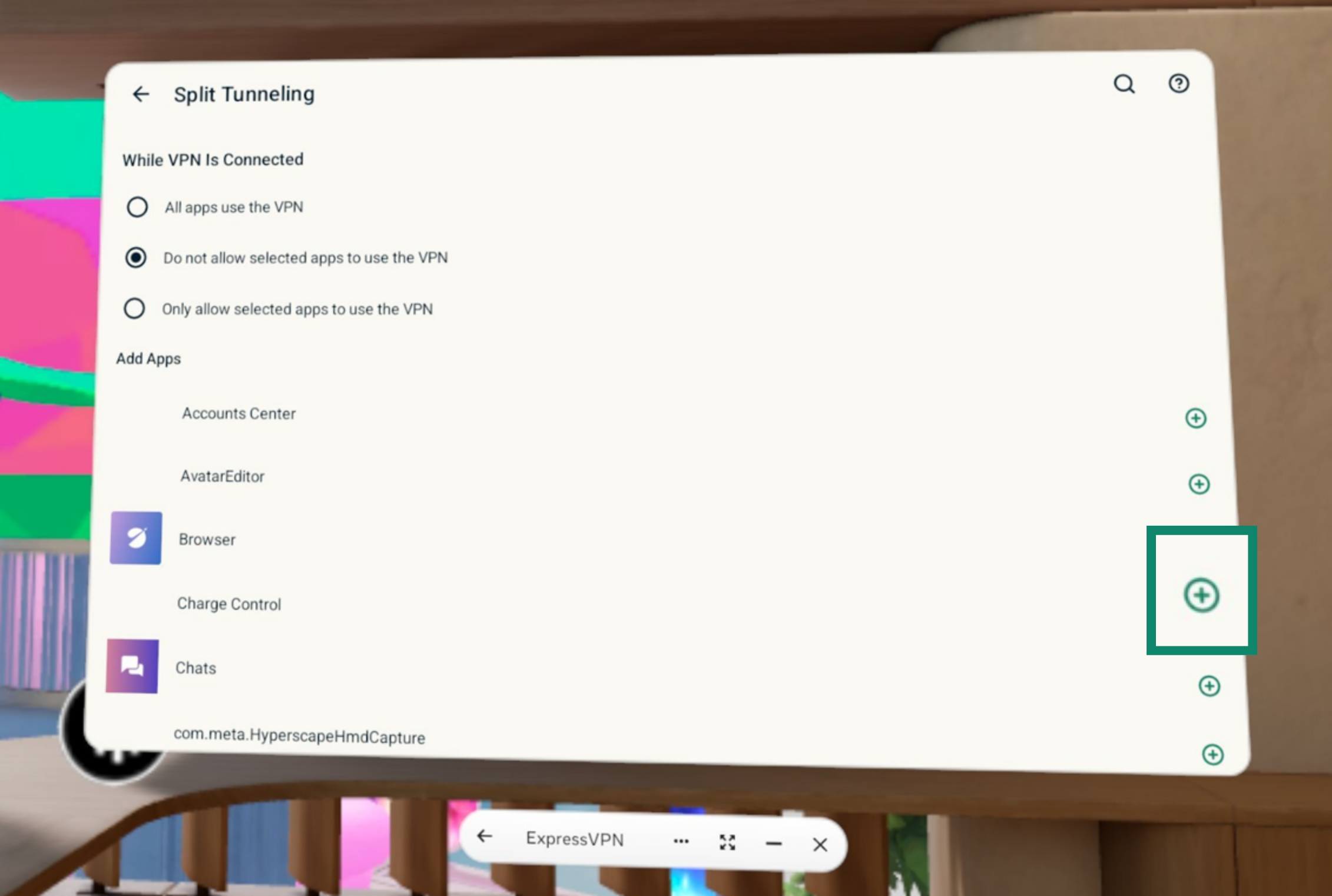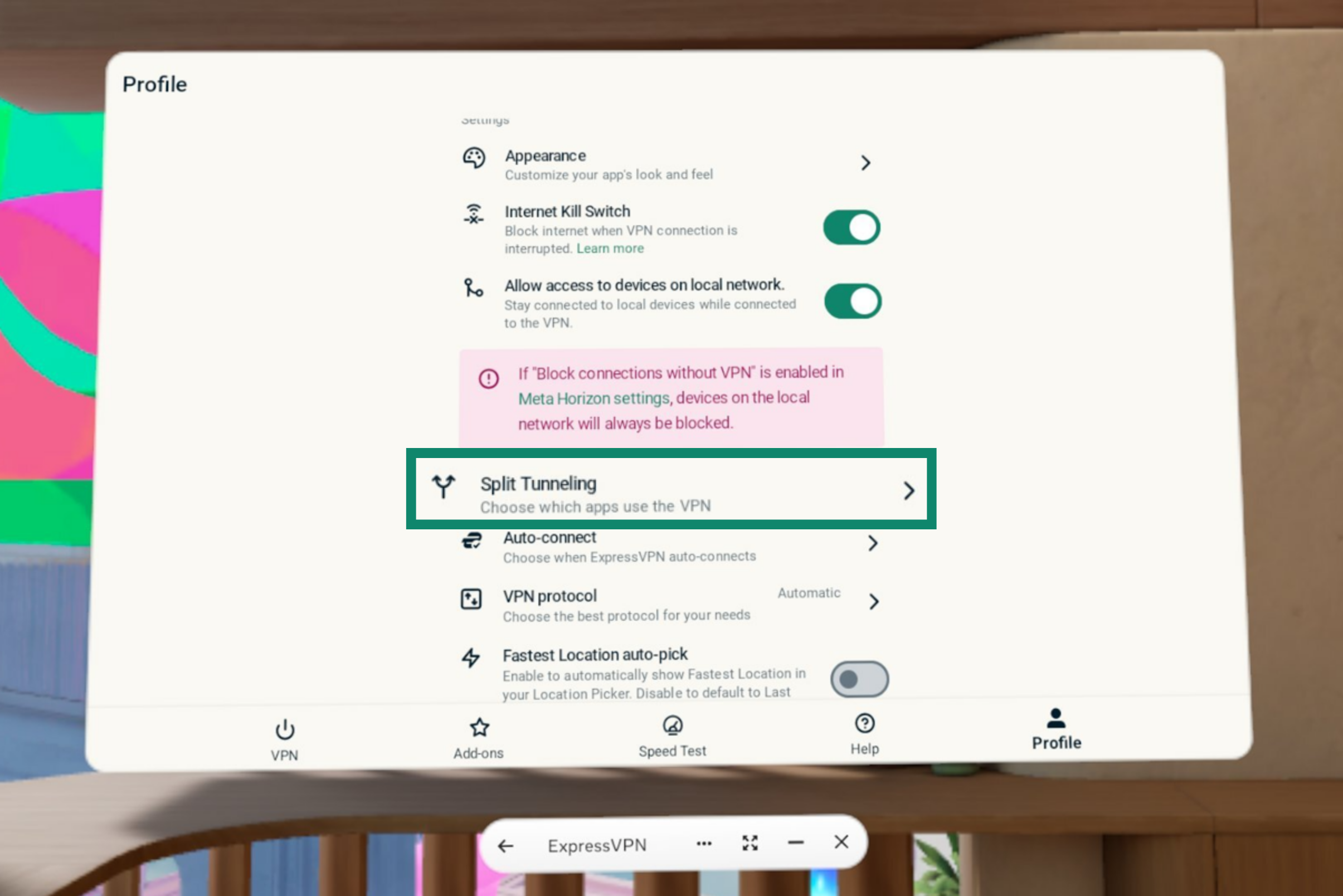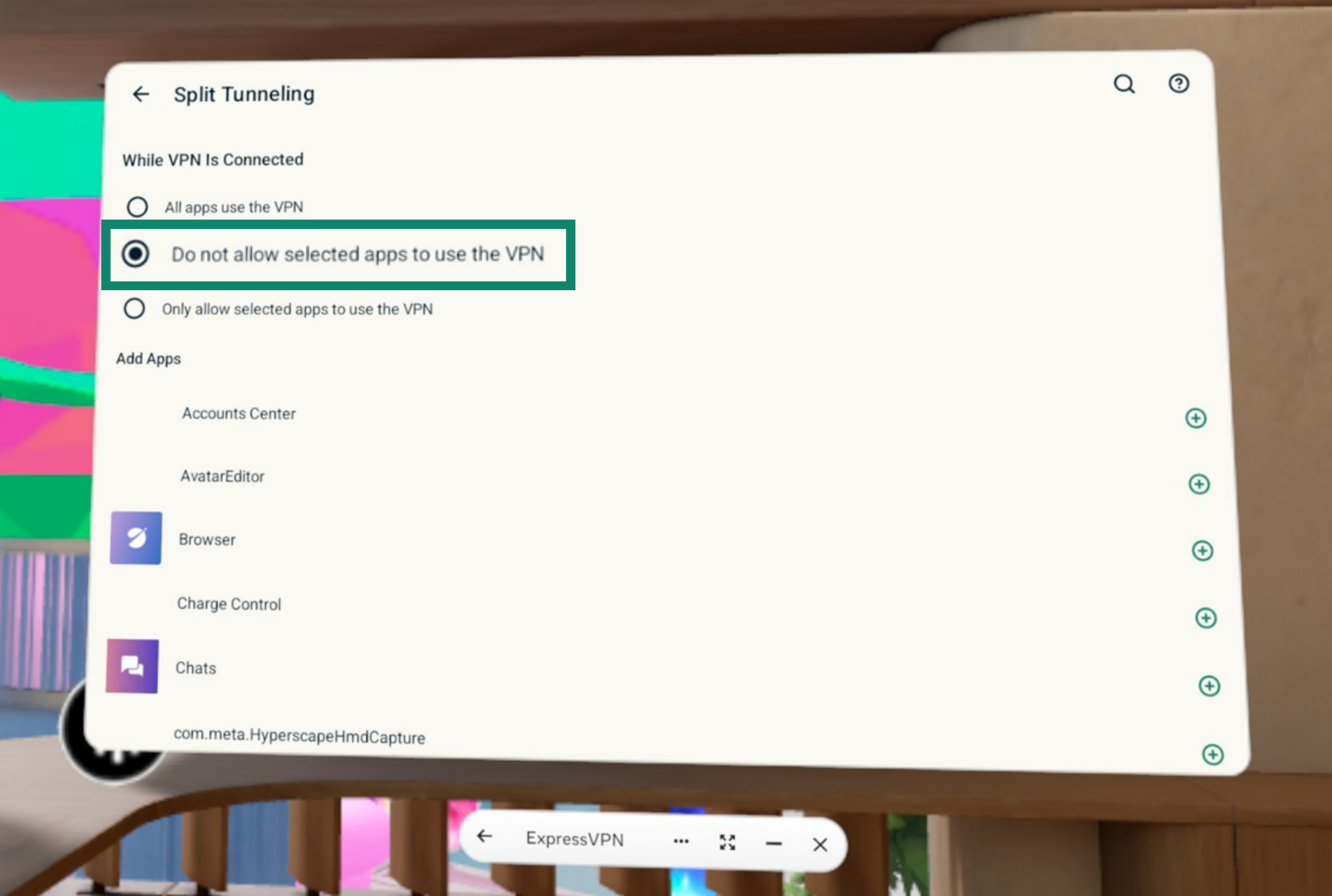 By default, all apps use the VPN when you connect to a VPN server location. To set up split tunneling rules for different apps on Meta Quest: