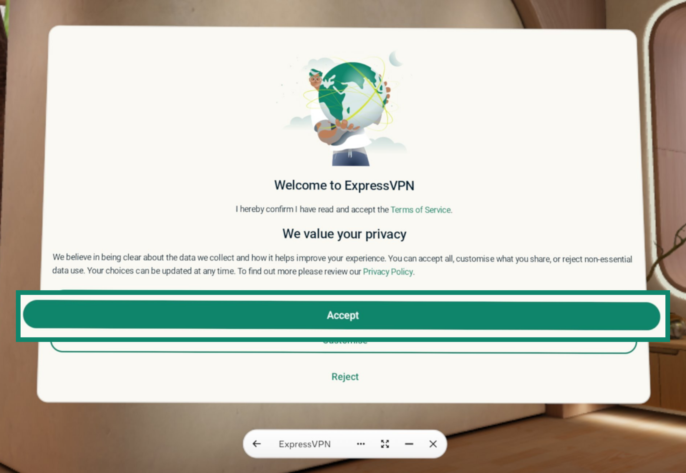 - The app will ask you to read and accept the ExpressVPN Terms of Service and choose what level of data you share. Select your preference to continue.