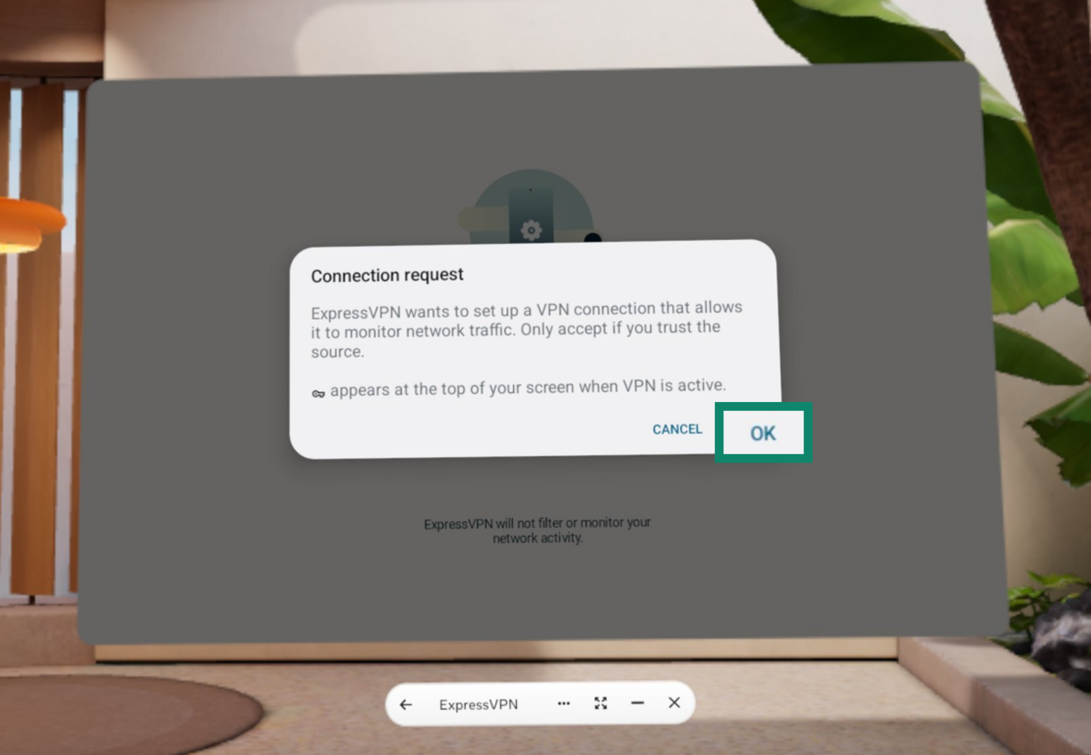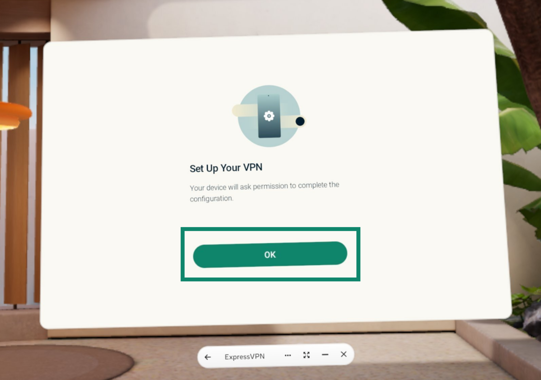 - You will be prompted to set up your VPN and approve connection requests by ExpressVPN. Select OK.