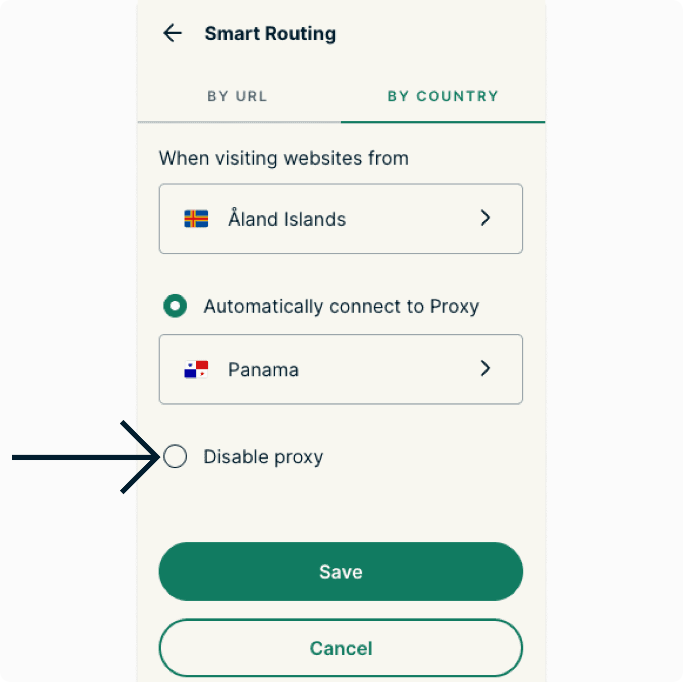 - Next, you can choose whether you want to automatically connect to a proxy location when visiting websites from your chosen country, or whether you want the proxy disabled when visiting websites from that country:
